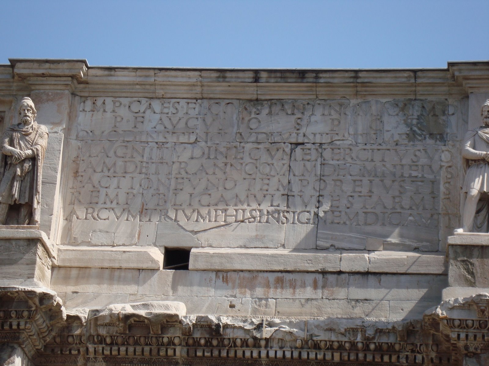 IMP · CAES · FL · CONSTANTINO · MAXIMO · P · F · AVGUSTO · S · P · Q · R · QVOD · INSTINCTV · DIVINITATIS · MENTIS · MAGNITVDINE · CVM · EXERCITV · SVO · TAM · DE · TYRANNO · QVAM · DE · OMNI · EIVS · FACTIONE · VNO · TEMPORE · IVSTIS · REM-PVBLICAM · VLTVS · EST · ARMIS · ARCVM · TRIVMPHIS · INSIGNEM · DICAVIT