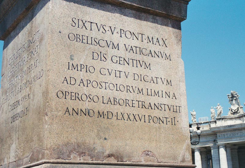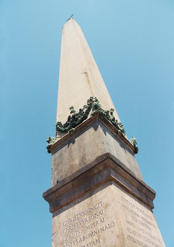 In 1586, Pope Sixtus V had Nero's obelisk, which was the center piece of Nero's circus, moved it 275 yards to the present location. The obelisk was placed on a new base. The inscriptions on the north and south sides of the base have texts written by Cardinal Silvio Antoniani as a memorial to the moving of the obelisk. The east and west sides have exorcist formulas.